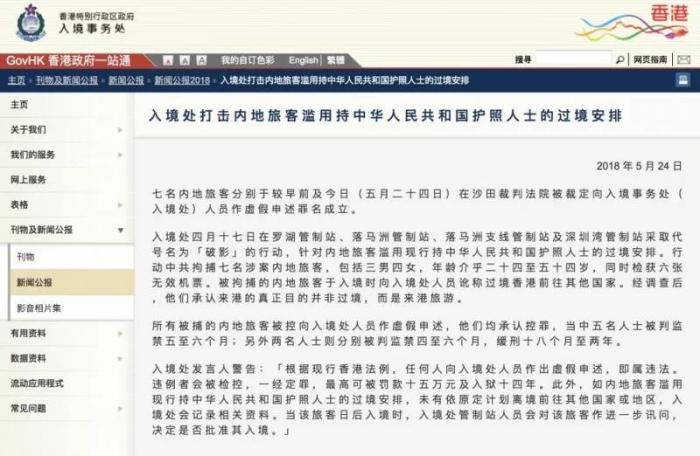 日前,香港入境处开展“破影行动”,打击内地旅客滥用持护照的过境安排。5月24日,7名内地旅客在沙田裁判法院被裁定向入境处人员作虚假申述罪名成立,当中5名人士被判监禁5至6个月。