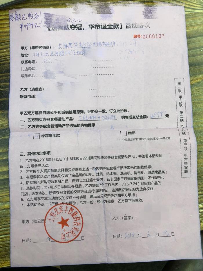 16日上午10时许,上海永乐生活电器漕宝路店迎来第一位退款用户。该用户在6月13日购买了华帝4999元的“夺冠套餐”,包括一个油烟机和一个灶具。按照规定,在其出示了个人身份证件、活动协议、发票凭证等材料之后,由经销商直接打款给顾客,约半小时后,4999元退款到达顾客的银行卡上。