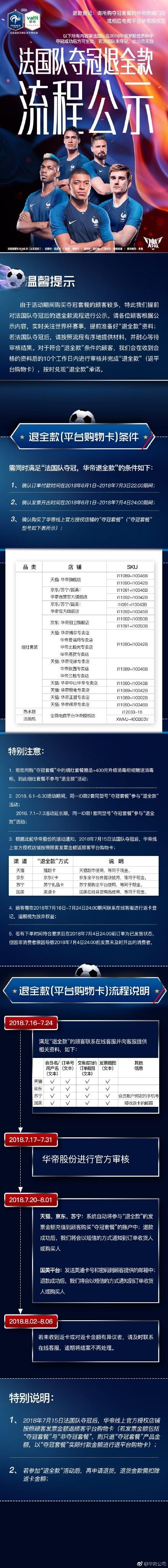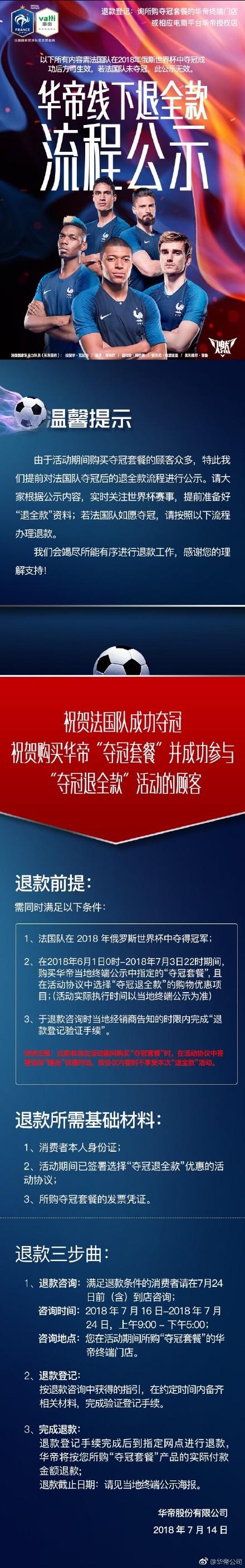据了解,就在法国队夺冠之后,华帝第一时间启动退款流程。对于线上购买的产品,华帝采取授权天猫、京东、苏宁、国美等旗舰店,按顾客发票金额返还顾客平台购物卡的方式来进行;而线下,全退款则需到购买“夺冠套餐”的华帝终端店按实际付款金额进行退款,不过具体退款形式并没有有详细公布。不管是线上还是线下的退款,消费者都必须在7月24日之前提出申请。