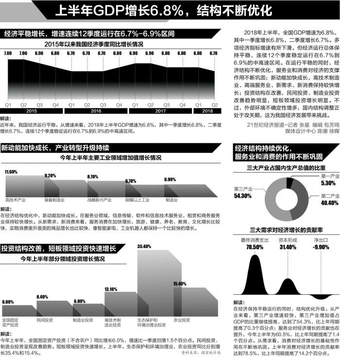 《21世纪》:二季度GDP增速虽略有下降,但6月份调查失业率是4.8%,调查失业率继续维持较低的水平,就业形势依然很好。如何看待二季度6.7%、上半年6.8%的增速?