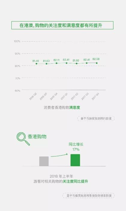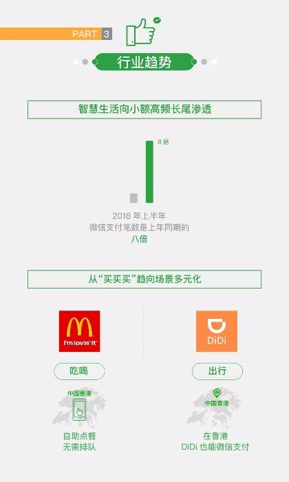 数据显示,2018年上半年,微信支付在港澳地区的支付笔数比去年同期增长了7倍。这意味着,微信支付不断深入大街小巷,向小额高频场景渗透的趋势显著。与此同时,在内地消费者对香港购物的满意度上,2017年第四季度同比上涨0.47个百分点。