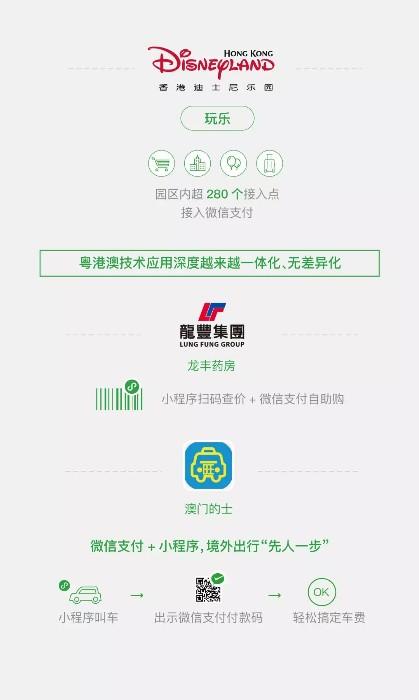 目前,微信支付在港澳地区的普及速度也越来越快。香港迪士尼乐园在园区内超过280个接入点接入微信支付;香港麦当劳与微信支付合作推出自助点餐服务;内地游客在香港打车也可以使用微信支付;龙丰集团旗下的龙丰药房推出了香港首家药妆微信支付旗舰店,以及澳门的士则实现了小程序叫车等。