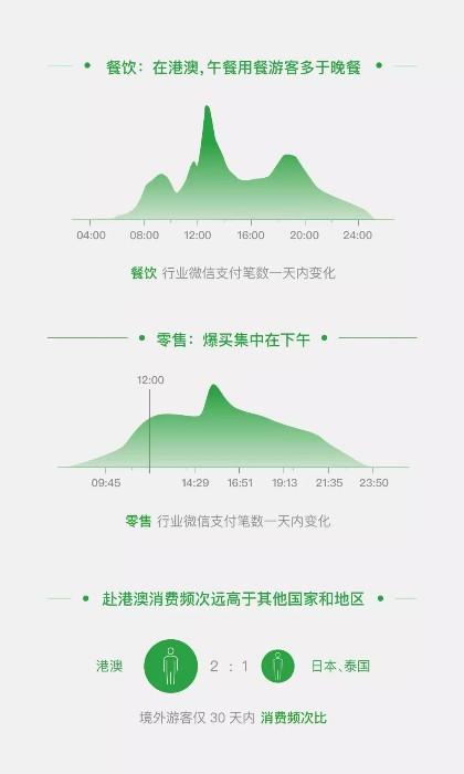 在城市分布方面,深圳、广州、东莞、佛山、珠海是赴港澳旅游人数最多的五个城市。美妆、日用零售、便利店、免税店、珠宝成为赴港澳游客花钱最多的几种场景。在餐饮行业,吃午餐的人数明显高于晚餐;零售行业“爆买”的情况也集中在下午时段。仅2018年5月1日至6月1日30天内,内地游客在港澳的消费频次就达到了日本、泰国的2倍。