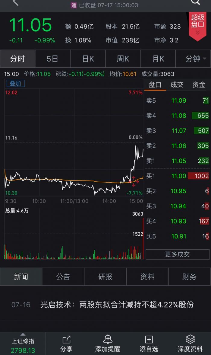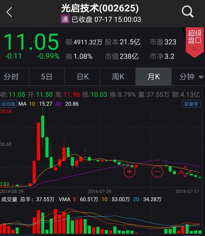 7月17日,光启技术,股价开盘重挫,盘中跌幅一度超过7.62%,尾盘却急速拉升,最终仅微跌0.99%,报收于11.05元。对于股权质押屡创新高的光启技术控股股东来说,今天无疑是惊悚的一天。
