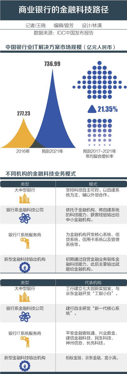 国际分析机构IDC报告指出,2016年中国银行业IT解决方案市场的整体规模达到277.23亿元人民币,其预测该市场2017到2021年的年均复合增长率为21.35%,预计到2021年达到736.99亿元。这个数百亿量级的市场,除IBM、神州信息、长亮科技等传统IT服务商之外,以兴业数金、平安金融壹账通、建信金融科技以及蚂蚁金服、京东金融等为代表的新型机构也入场分羹。