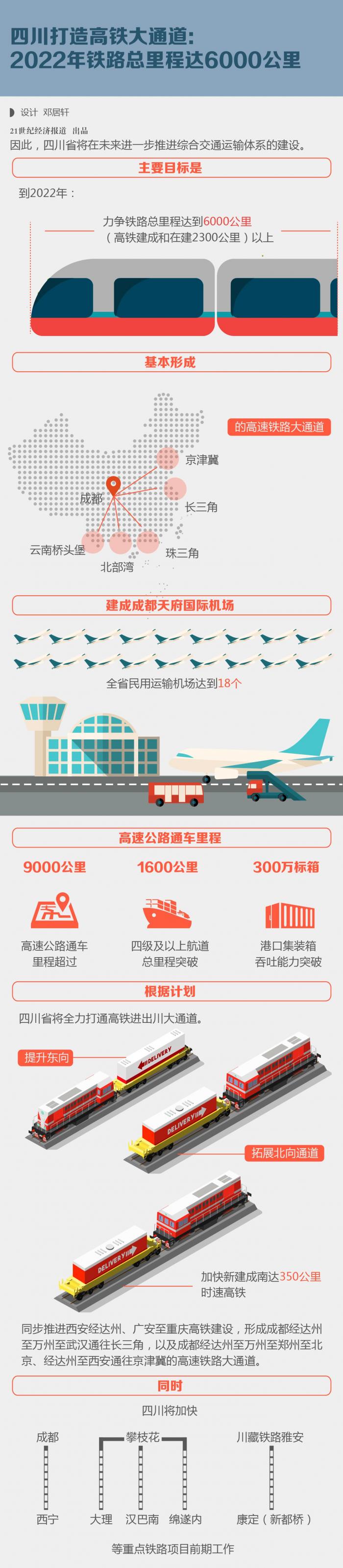 因此,四川省将在未来进一步推进综合交通运输体系的建设。主要目标是:到2022年,力争铁路总里程达到6000公里(高铁建成和在建2300公里)以上,基本形成成都至京津冀、长三角、珠三角、北部湾及云南桥头堡的高速铁路大通道;建成成都天府国际机场,全省民用运输机场达到18个;高速公路通车里程超过9000公里,四级及以上航道总里程突破1600公里,港口集装箱吞吐能力突破300万标箱。