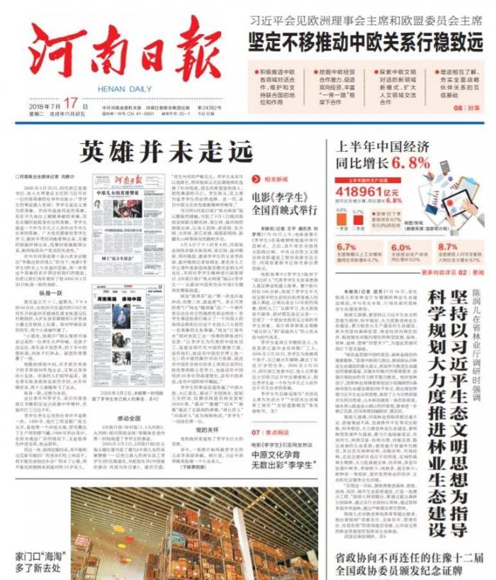 2005年3月2日,河南日报第一时间报道了李学生舍己救人的事迹。今天的河南日报头版,英雄再“归来”,他就走在我们每一个出彩河南人的中间!