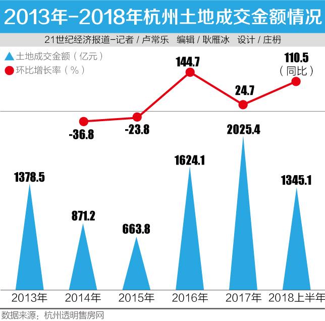 据杭州透明售房网统计数据显示,2016年至今,杭州土地市场的出让成交额不断打破先前的历史记录。其中,2016年的土地成交额为1624.1亿元,环比上涨144.7%;2017年的土地成交总额达到2025.4亿元,环比增幅为24.7%。