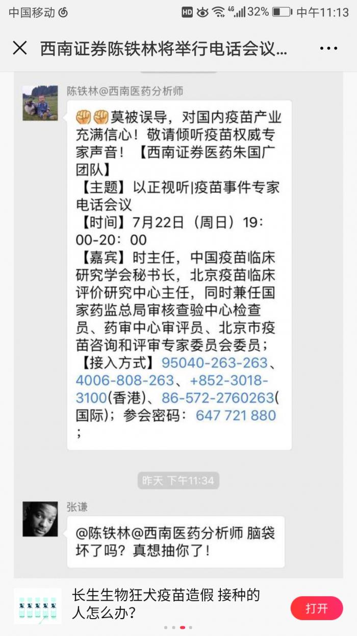 7月21日,西南证券医药团队在微信群发布消息称将在7月22日晚间召开电话会议,主题是”以正视听|疫苗事件专家电话会议”,该团队同时提出“莫被误导,对国内疫苗产业充满信心”。