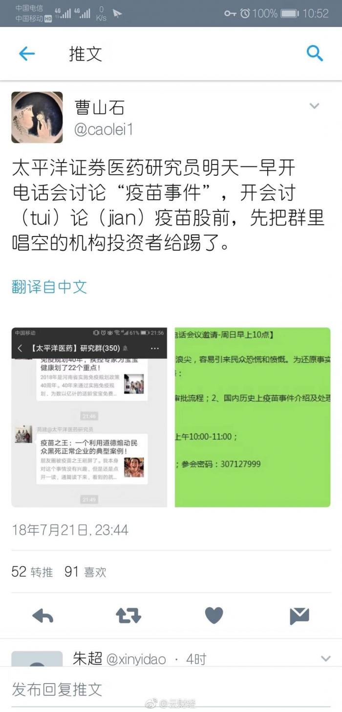 随后即有机构人士提出质疑,据曹山石微博,野村证券首席经济学家陆挺指出,不知道这位券商医药首席有多大的信心说”莫被误导”?即使对“国内疫苗产业”有信心,是否就等于对每个国内生产疫苗的企业有信心?是否就对各种国产疫苗都有信心?作为一个卖方医药研究员,应该做的,是先把舆论涉及的几家公司研究清楚,如果有胆量有能力,就让这几家公司的负责人出来做个电话会议,接受公众质询,认真回答舆论关心的问题,而不是捧出一个带着一堆头衔的所谓“权威专家”来,劝大家“莫被误导”。做券商卖方研究应该遵循一些必要准则,所以真心给这个医药研究员提个建议,这种电话会议没必要搞,省了这笔专家费拿去调研这几个企业吧。