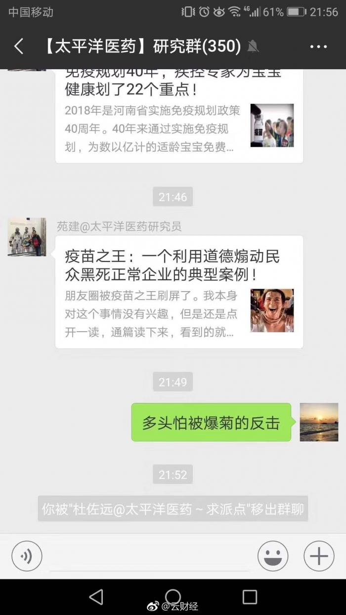 一份聊天截图显示,7月21日晚间,太平洋证券医药团队的研究群里,研究员将唱空的机构投资者移出群聊。