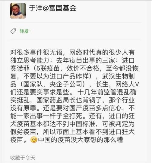 除了卖方分析师,重仓康泰生物的富国基金基金经理于洋也在朋友圈发布言论指出,“对很多事件很无语,网络时代真的很少人有独立思考能力”,“十几年前监管混乱确实挺乱,国家药监局长也背锅了,那个行业没有原罪。还是要对国产疫苗多点信心,不能一家出事一杆子全打死”。