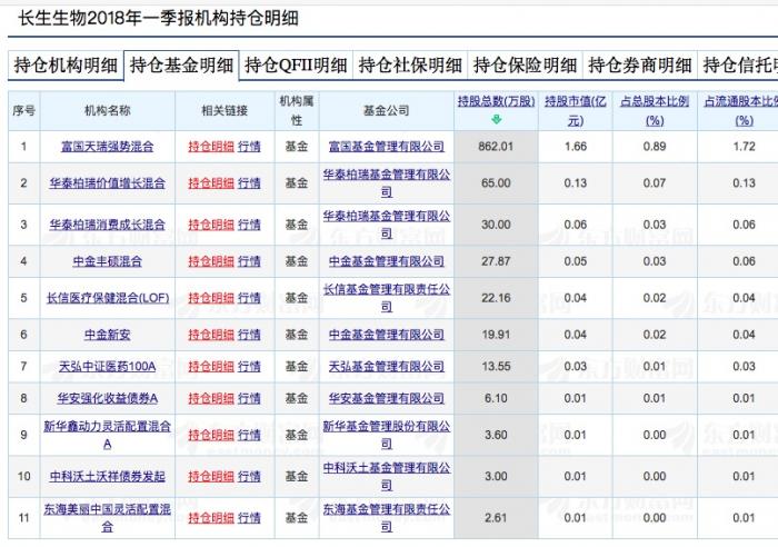 今年一季度,富国基金旗下的富国天瑞强势混合持股最多,有862.01万股,占流通股比例为1.72%,同时是一季度长生生物的第7大流通股东。