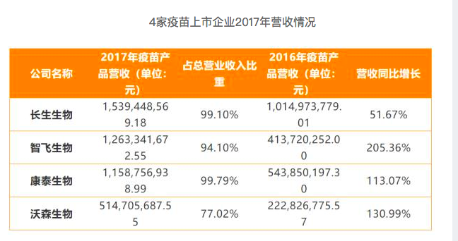 以国内主板上市的4家疫苗企业——长生生物、智飞生物、康泰生物、沃森生物为例,长生生物疫苗产品销售收入在保持十亿元级基础上,较2016年稳定增长51.67%,达15.39亿元;智飞生物疫苗产品销售收入增长最为迅猛,同比增幅达205.36%,从亿元级的营收增长至十亿元级;康泰生物的疫苗产品销售收入也实现十亿元级的突破,约11.59亿元,同比增长113.07%;相对而言,沃森生物的疫苗产品总体营业收入比例为77%,但相比2016年也有130%的增长。