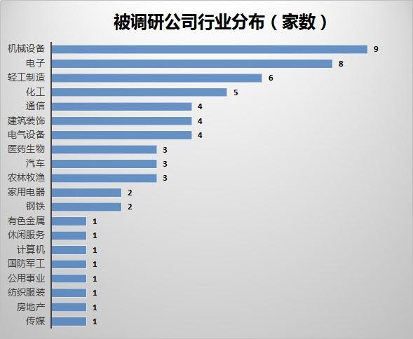 从行业分布来看,与此前连续8周都最关注化工行业不同,本周机械设备最受青睐,拓斯达、赢合科技等9家公司获调研。