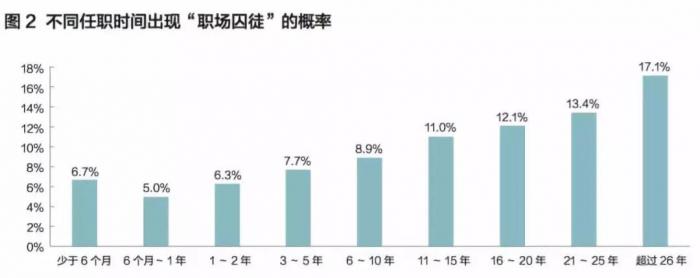 此后,随着任职时间的增加,员工成为“囚徒”的概率开始逐步升高,任职达到26年以上的员工,概率攀升至17.1%。