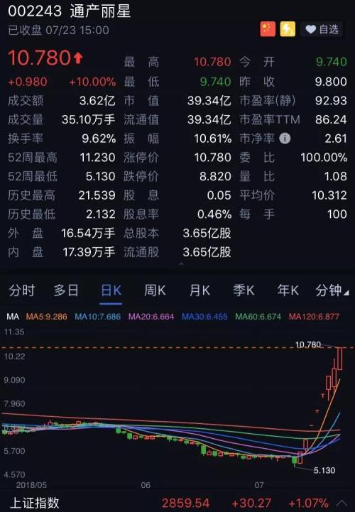 上周五已经打开涨停板的通产丽星,今日再度封上了涨停。这是该股近8个交易日里的第7个涨停板,致其7月12日以来的累计涨幅已达102%。