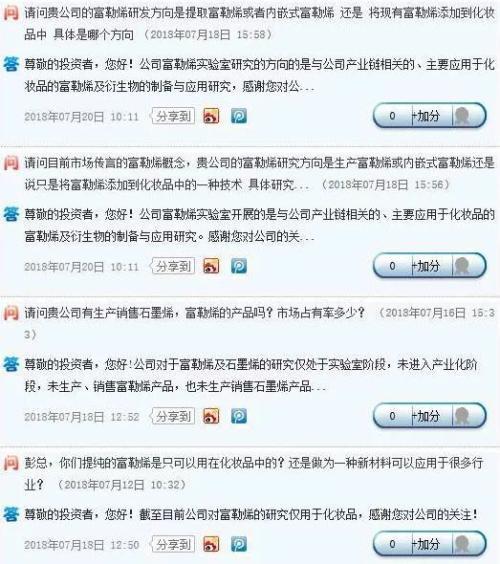 由于该项目投资未达到信息披露要求,且仍处于研发阶段,尚未能对公司形成业绩贡献,所以公司在年报里很少提及富勒烯碳纳米工程实验室项目。但是,这个富勒烯实验室项目却是深交所互动易平台上被投资者问及最多的话题。