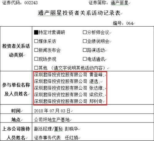 值得注意的是,在通产丽星本轮连涨行情爆发前,深圳君择投资控股有限公司曾前往公司调研。