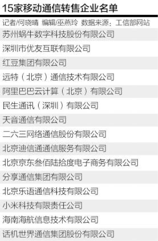 在首批15家企业中,包括阿里、小米、京东等在内的互联网上市巨头旗下公司均领衔上榜,涵盖电商(阿里通信、京东通信)、渠道商(天音通信、爱施德等)、终端商(小米移动)等各类型企业。