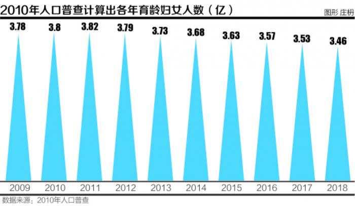 在这项工作的背后,一个因素不容忽视。根据全国2010年人口普查数字,当年的育龄妇女(指年龄在15-49岁的女性)约3.8亿人,此后每一年,将新满50岁的女性人数剔除,加入新满15岁的女性人数,可以大致得出下一年育龄妇女的数量(因影响微弱,未考虑相应年龄段死亡人口数量)。按2010年的人口普查数据推算,到2018年,全国育龄妇女人数约为3.46亿人,这一数据较2017年降低约700万人,创下历史新高。而在2017年,育龄妇女人数比上一年减少了400万人左右。