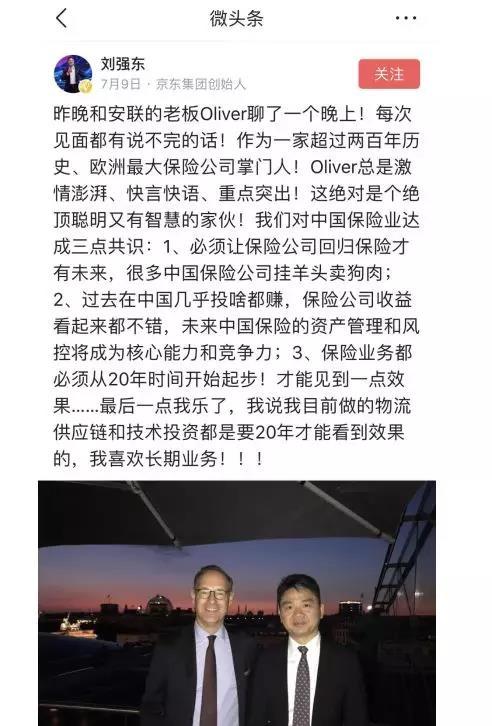 7月9日,刘强东在头条号上分享了与安联保险CEO谈话的心得,短短一段文字,用了9个感叹号。