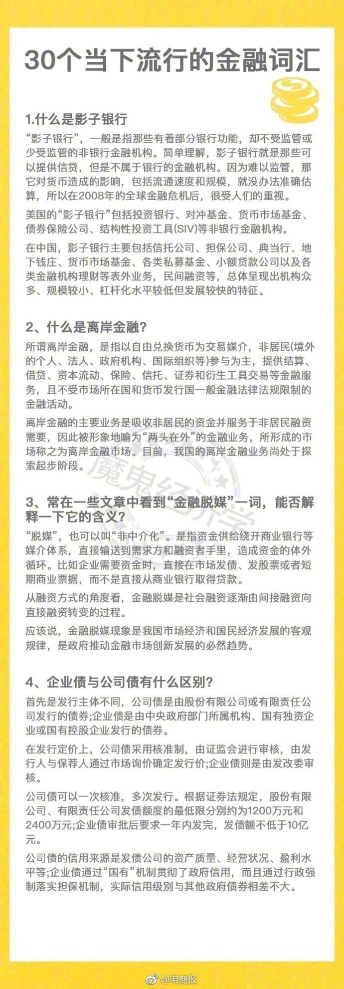 什么是影子银行?什么是离岸金融?常在一些文章中看到“金融脱媒”一词,能否解释一下它的含义?......你应该知道的30个当下流行的金融词汇!