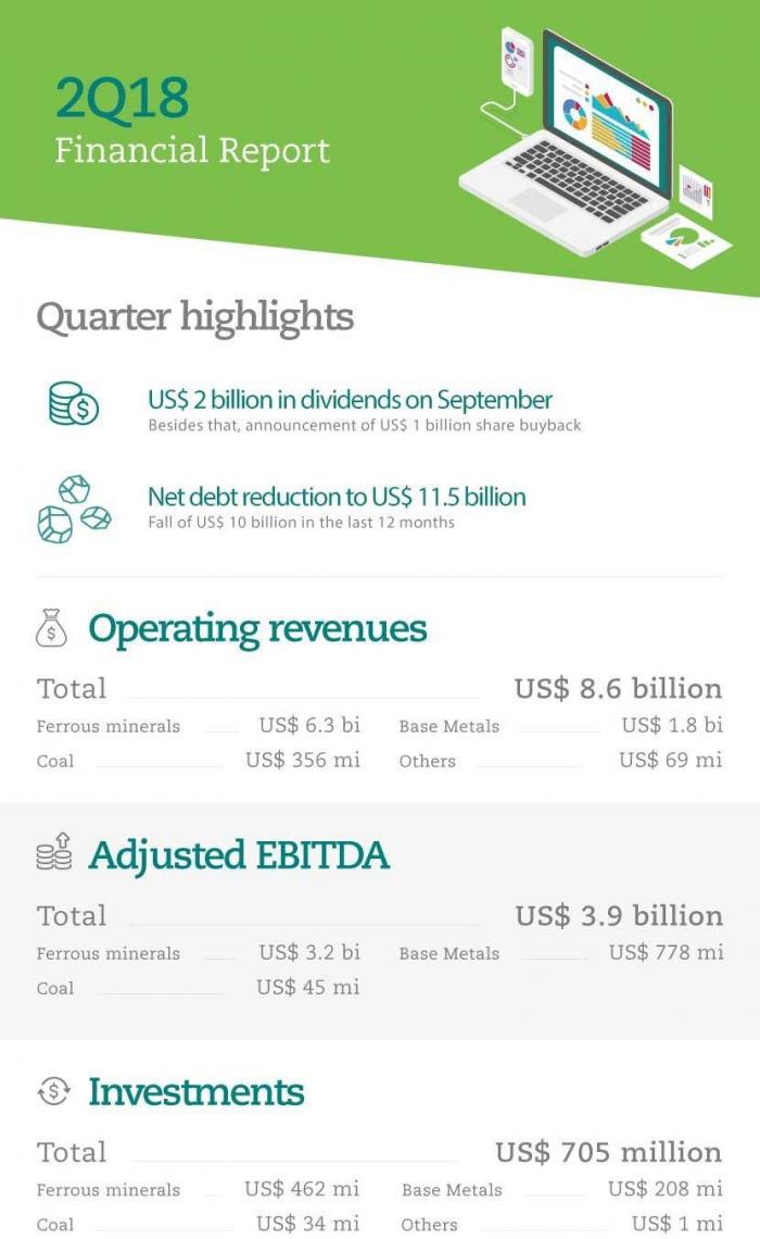 淡水河谷首席财务官习亚宁先生(Mr. Luciano Siani Pires)强调:“我们正在不断接近我们的净负债目标,我们已能感受到削减负债对信用评级及利息总额的积极影响,穆迪于近期调高了对淡水河谷的评级,2018 年上半年的利息总额亦从去年同期的 9.00 亿美元减少至 6.30 亿美元,降幅达 30%。”