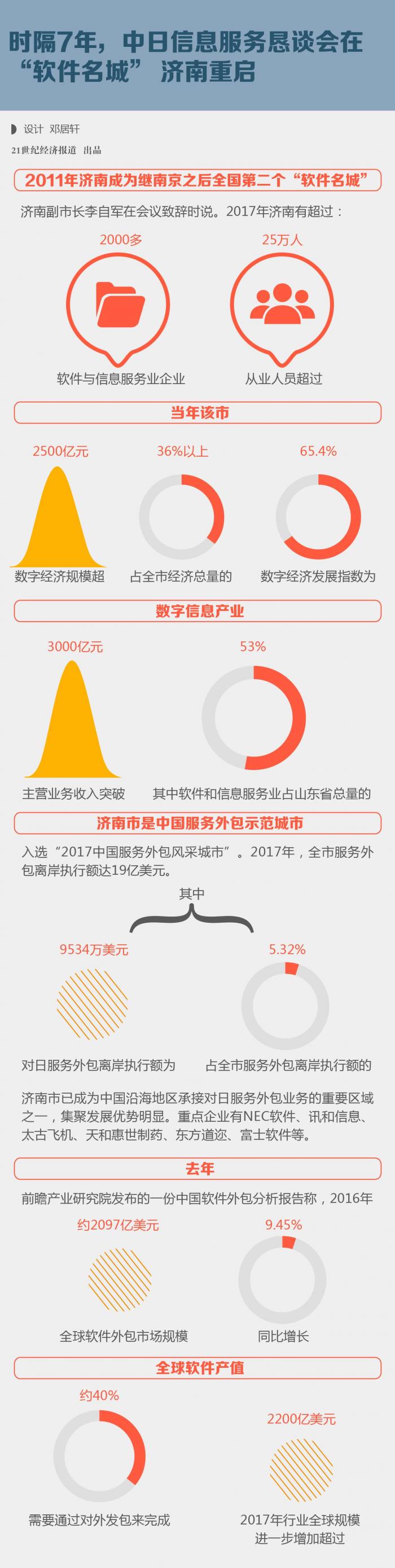 被定位为中日两国软件和信息服务业交流“里程碑”的这一届恳谈会之所以选择济南,上述济南商务局负责人认为有以下几点:一是济南产业基础厚重,2018年上半年,济南软件和信息技术服务业实现软件业务收入1151.5亿元,同比增长13%;二是服务贸易优势强,上半年,全市离岸执行额为10亿美元,同比增长14.3%。其中对日服务外包离执额为5039万美元,同比增长18.1%;三是后发优势明显,济南拥有高新技术开发区和章丘明水开发区2家国家级开发区、7家省级以上经济开发区;四是发展平台最给力,目前济南有包括齐鲁软件园在内的五大发展园区和平台;五是发展环境优美。