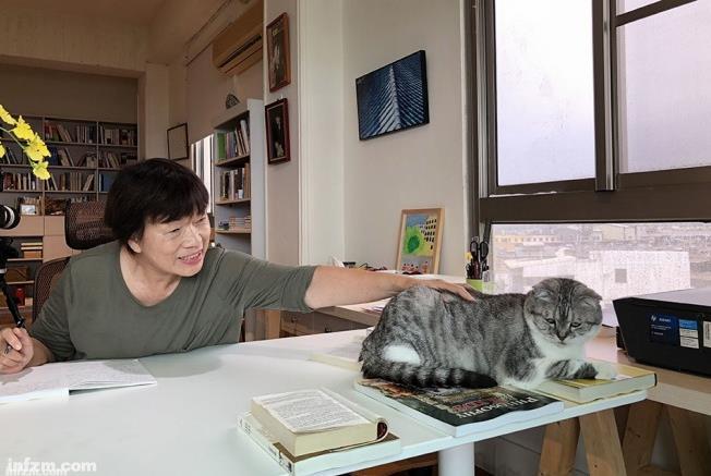 龙应台在屏东潮州小镇的写作室。写作之余,她会与一只肥猫玩耍。(张皓涵/图)