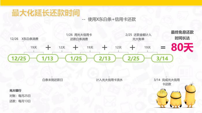 比如借了某东的白条,然后用信用卡还款,而信用卡又有账期,总共加起来长达80天的免息期(16年某东还没有固定对账日)。