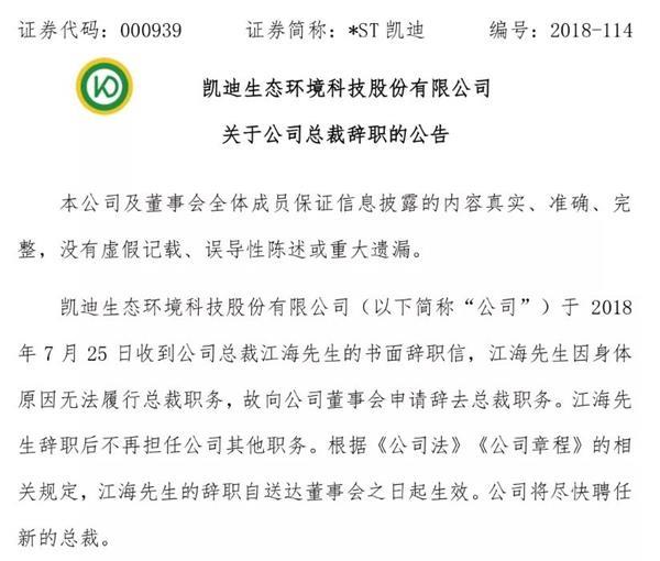 不过江海履任总裁仅仅半个月就辞职了。7月26日晚,*ST凯迪称收到江海的书面辞职信,江海因身体原因申请辞职,公司将尽快聘任新的总裁。