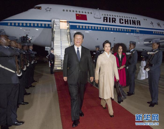 7月23日,国家主席习近平抵达比勒陀利亚,开始对南非共和国进行国事访问。习近平和夫人彭丽媛在机场受到南非外长西苏鲁等政府高级官员热情迎接。新华社记者李学仁摄