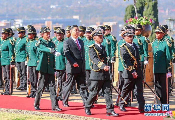 7月24日,国家主席习近平在比勒陀利亚同南非总统拉马福萨举行会谈。会谈前,拉马福萨为习近平举行隆重欢迎仪式。新华社记者谢环驰摄