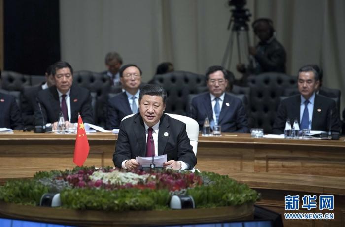 习主席说,金砖国家要坚定建设开放型世界经济,旗帜鲜明反对单边主义和保护主义,促进贸易和投资自由化便利化,共同引导经济全球化朝着更加开放、包容、普惠、平衡、共赢方向发展。习主席的讲话赢得现场热烈掌声。