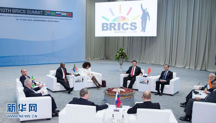7月26日,金砖国家领导人第十次会晤在南非约翰内斯堡举行。南非总统拉马福萨主持。中国国家主席习近平、巴西总统特梅尔、俄罗斯总统普京、印度总理莫迪出席。习近平发表题为《让美好愿景变为现实》的重要讲话。新华社记者李涛摄