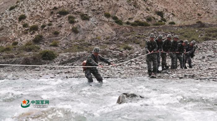 夏季的冰河水流湍急,新战士在老班长的帮助下逐个趟越冰河。严晓春摄