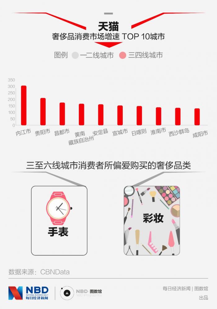 据《2017年新零售时代奢侈品消费趋势报告》显示,奢侈品市场中各县级城市消费者的件单价逐年增长,三至六线城市消费者购买奢侈品的件单价在2015年已超过一二线城市,线上奢侈品消费增速前10位城市也几乎均为三至六线城市。