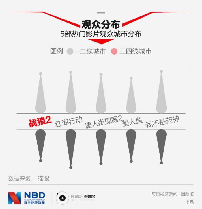《战狼2》的大卖,“小镇青年”功不可没。根据猫眼公布的数据显示,一二线城市为《战狼2》贡献了54%的票房,三四线等城市占比46%。《红海行动》等电影同样如此。