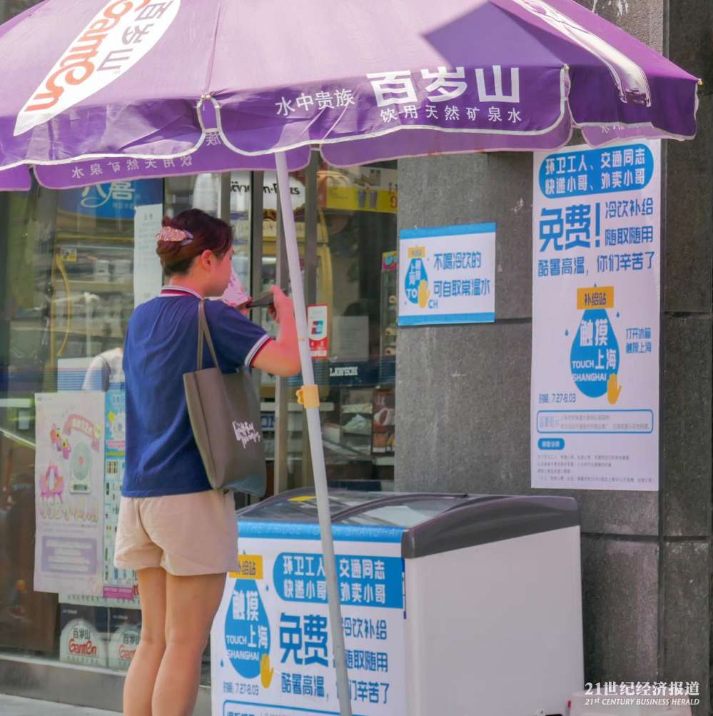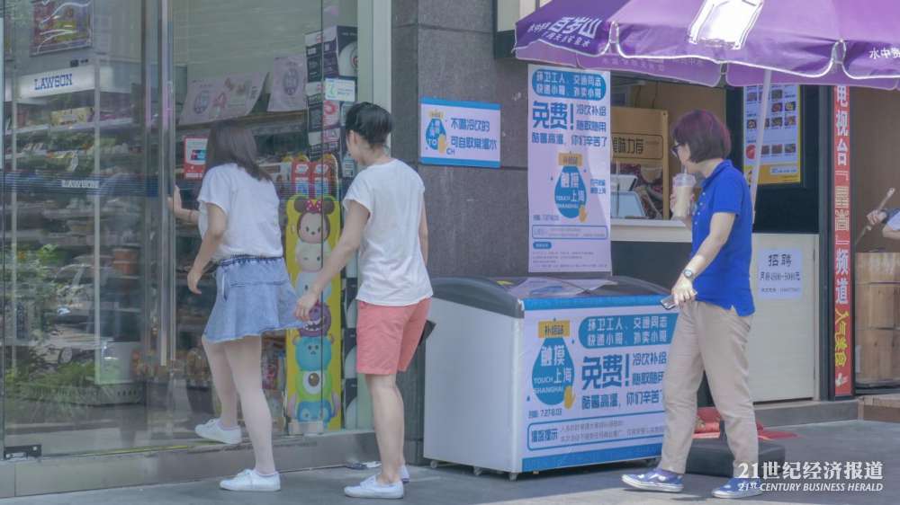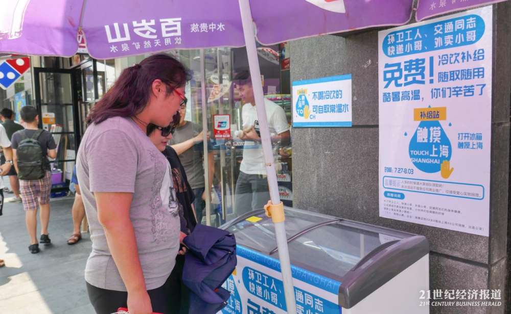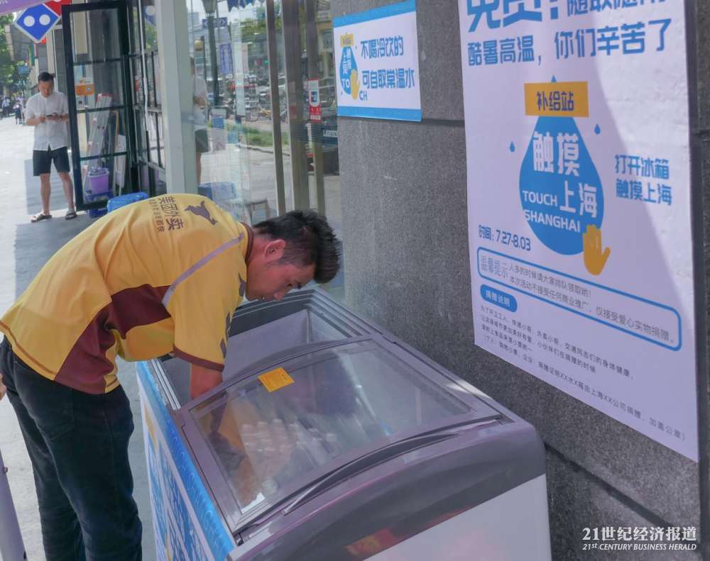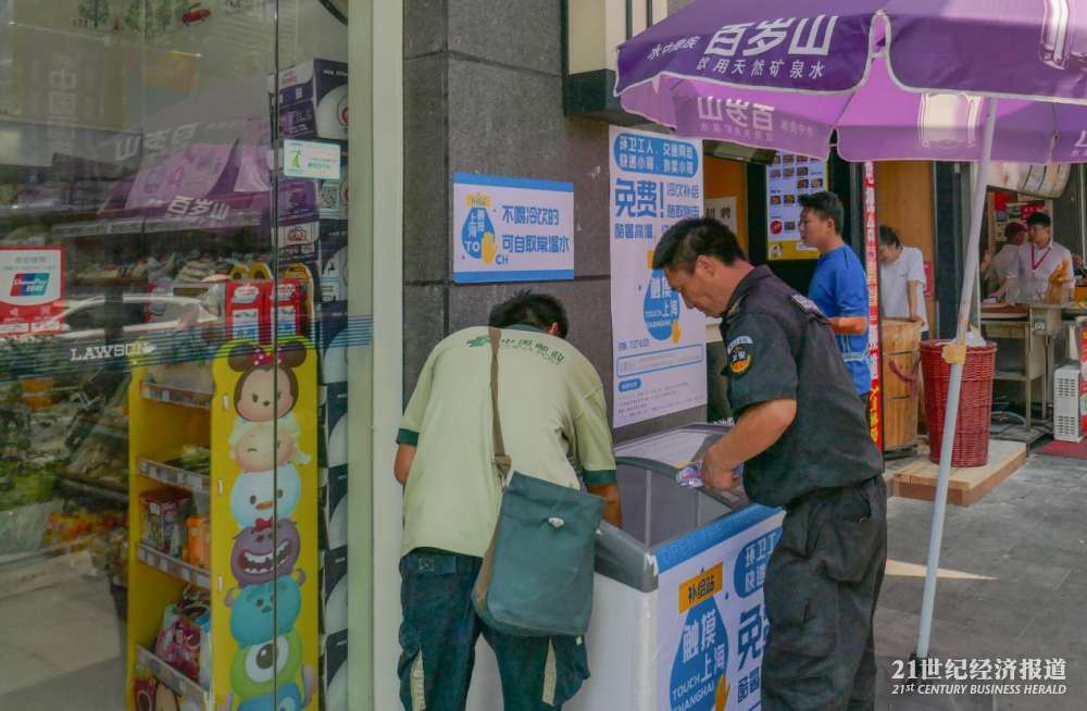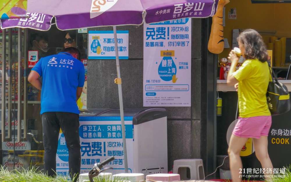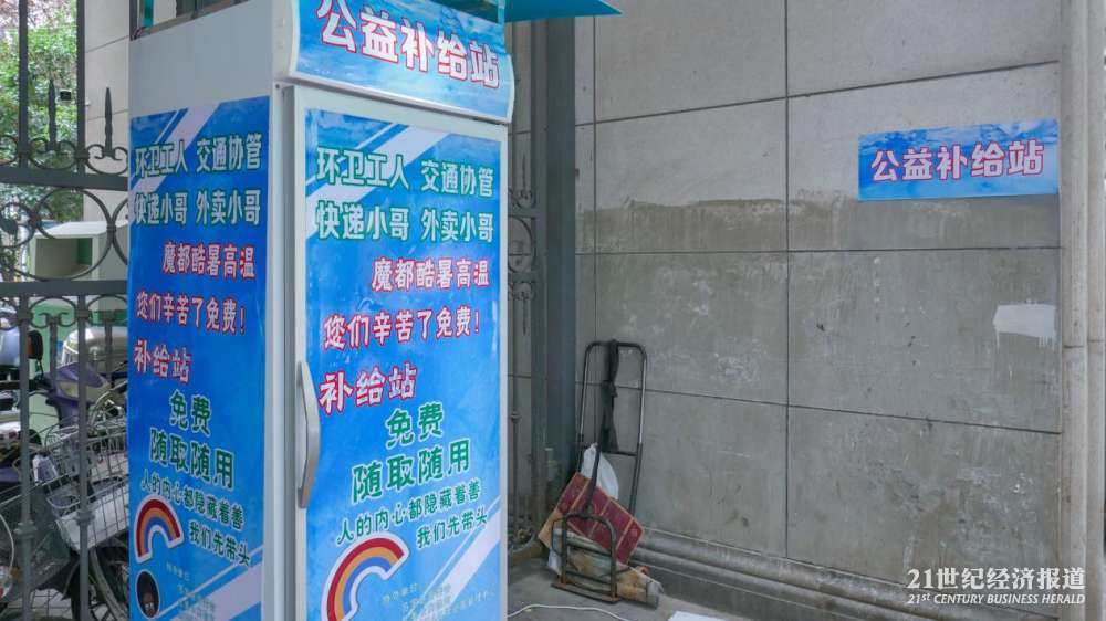 在上海普陀区曹杨路地铁站附近的“公益冰箱”,21中午时分在此待了大约两个小时,陆续看到环卫工、快递员、外卖小哥以及保安前来取水。