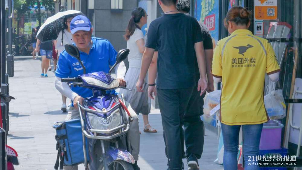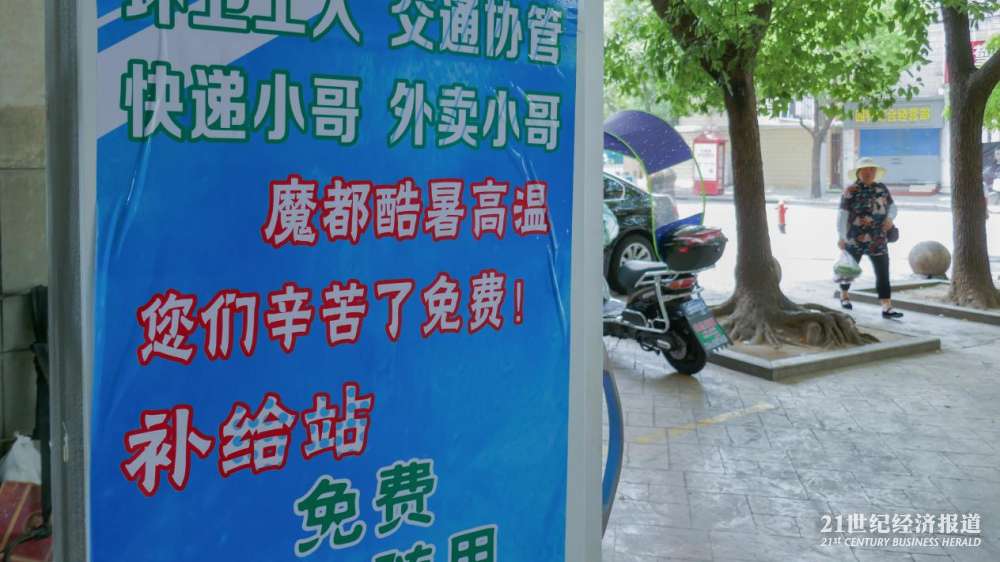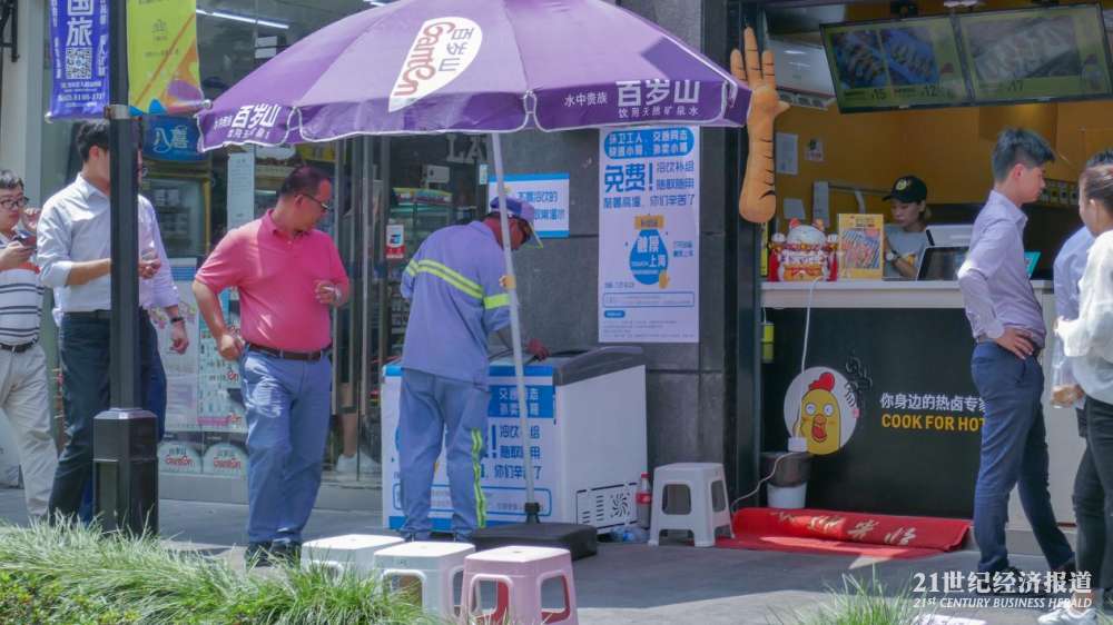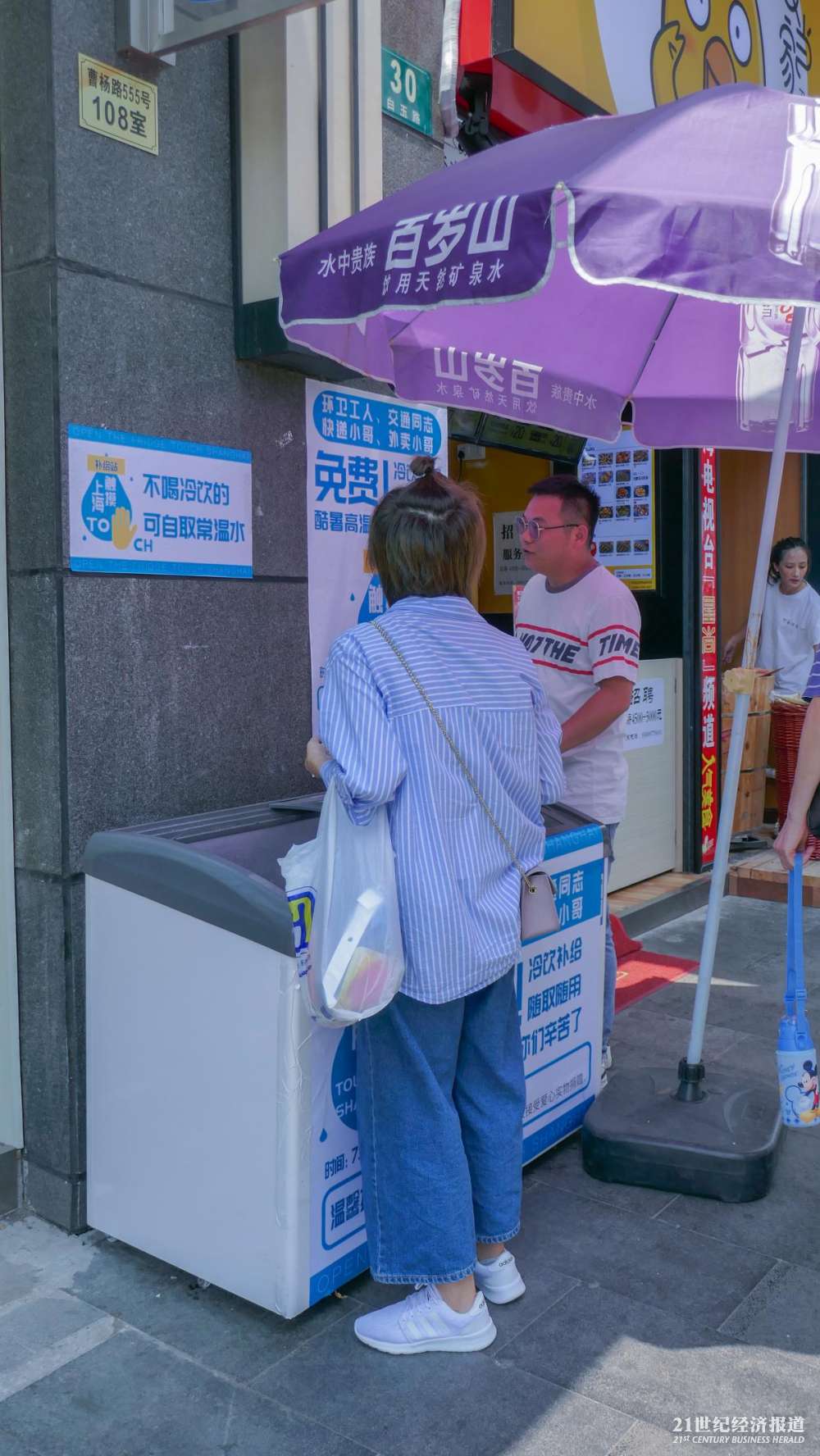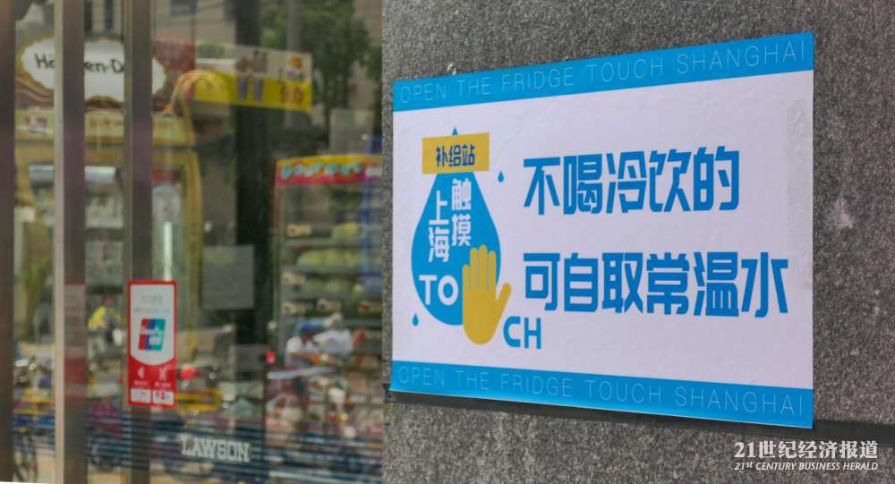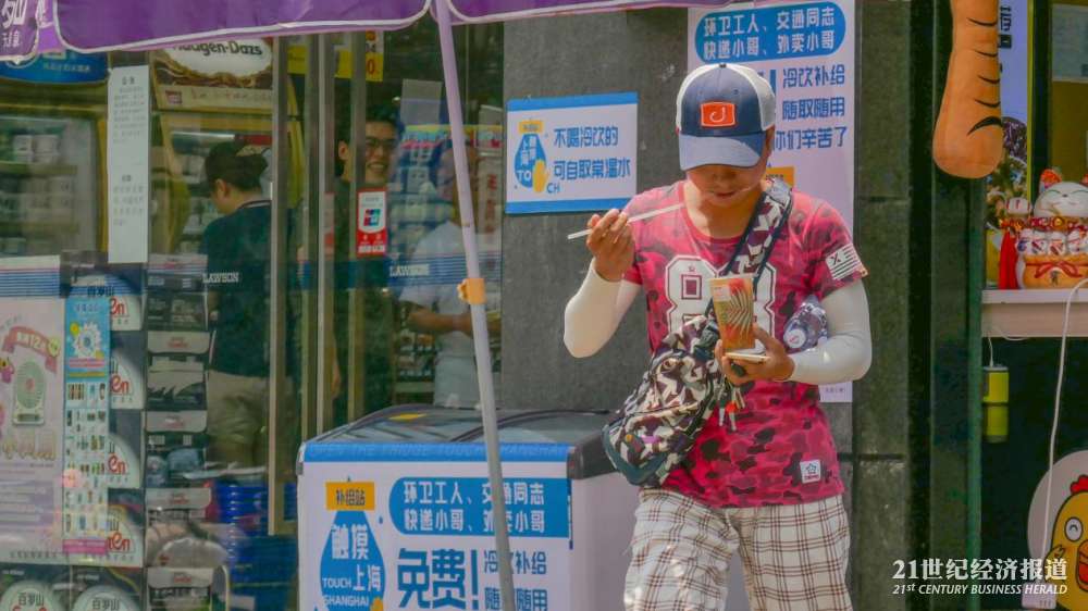 在上海普陀区曹杨路地铁站附近的“公益冰箱”,21中午时分在此待了大约两个小时,陆续看到环卫工、快递员、外卖小哥以及保安前来取水。
