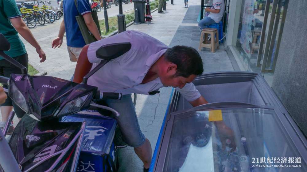 正在取水的外卖员。现场看到“公益冰箱”里的饮用水,多数人取一瓶就走,也有个别人一次取走多瓶水。