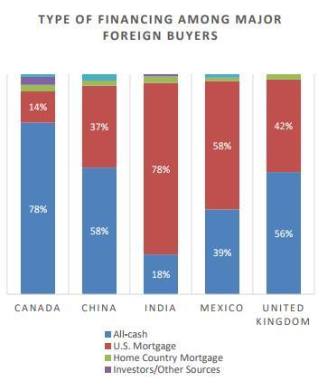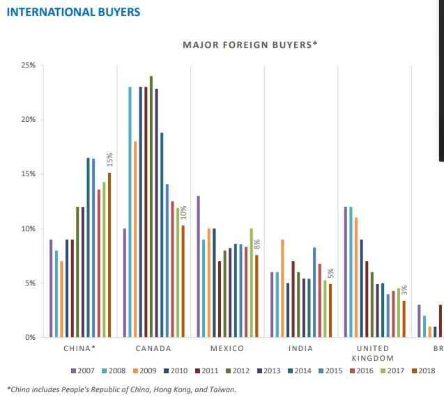 NAR报告为基于对10303家房产经纪公司的随机调查,调查时间为2018年4月10日-18日,对于美国房产国际买家的分析为基于这些经纪公司在2017年4月-2018年3月期间所完成的交易。