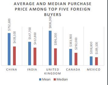 (外国买家在美国买房的平均花费和中位数 来源:NAR)