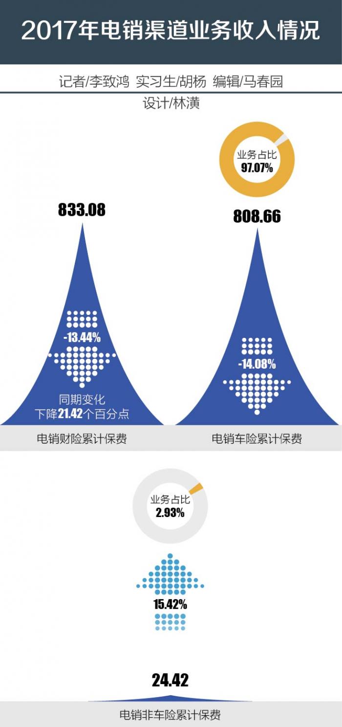 中国保险行业协会数据显示,2017年,共有28家财险公司开展电销业务。受市场监管环境的变化影响,各市场主体调整各展业渠道的经营思路,以适应新环境下的市场竞争,8月始,电销渠道业务明显下滑并持续负增长,12月当月保费收入同期负增长52.01%。
