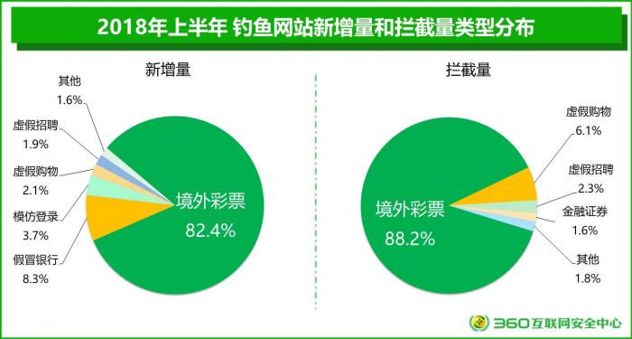 而在新增钓鱼网站中,境外彩票占比达82.4%,位居首位;拦截量方面,境外彩票也以88.2%的超高占比排名第一。