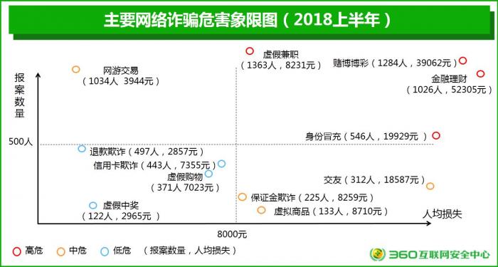 此外,报告中还给出了不同类型的网络诈骗在人均损失和举报数量的象限图,从图中可直观地看到哪些是低危、中危诈骗,哪些是案件高发、损失惨重的高危诈骗。