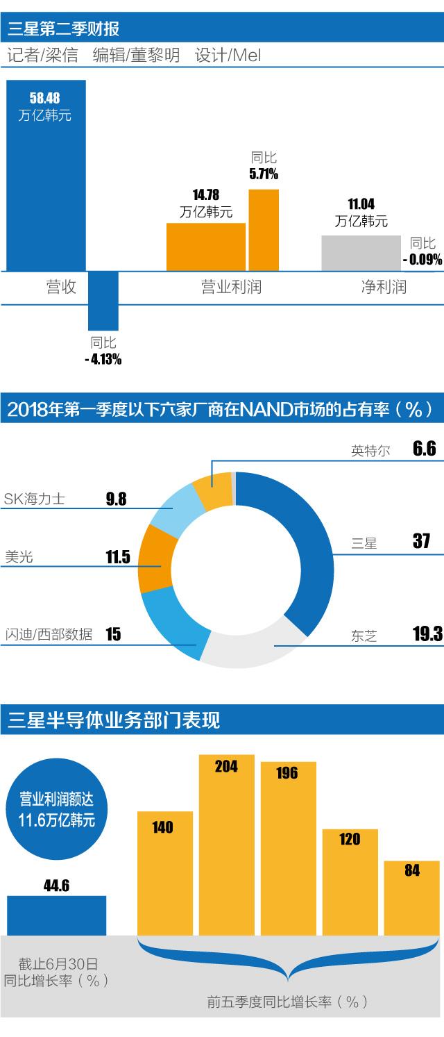 7月31日,三星电子发布截至2018年6月30日的第二季度财报。财报显示,公司该季度营收58.48万亿韩元(约合523亿美元),同比下滑4.13%;营业利润14.78万亿韩元(约合133亿美元),同比增长5.71%;净利润11.04万亿韩元(约合98亿美元),较去年同期下滑0.09%。