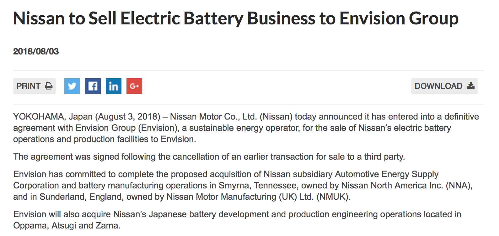日本日产汽车8月3日宣布,将把旗下电池业务出售给中国可再生能源企业远景集团,双方已签署最终协议。