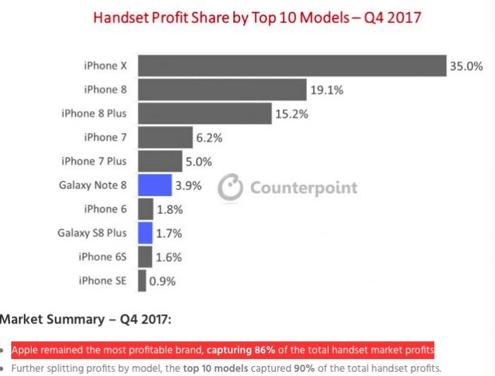 但是,众所周知,在手机产业中,苹果还是拿走了80%以上的利润。根据Counterpoint Research的数据,在2017年第四季度,苹果占据了86%的手机利润。并且,利润最高的10大手机型号拿走了90%的利润,均为苹果和三星手机(如下图所示)。